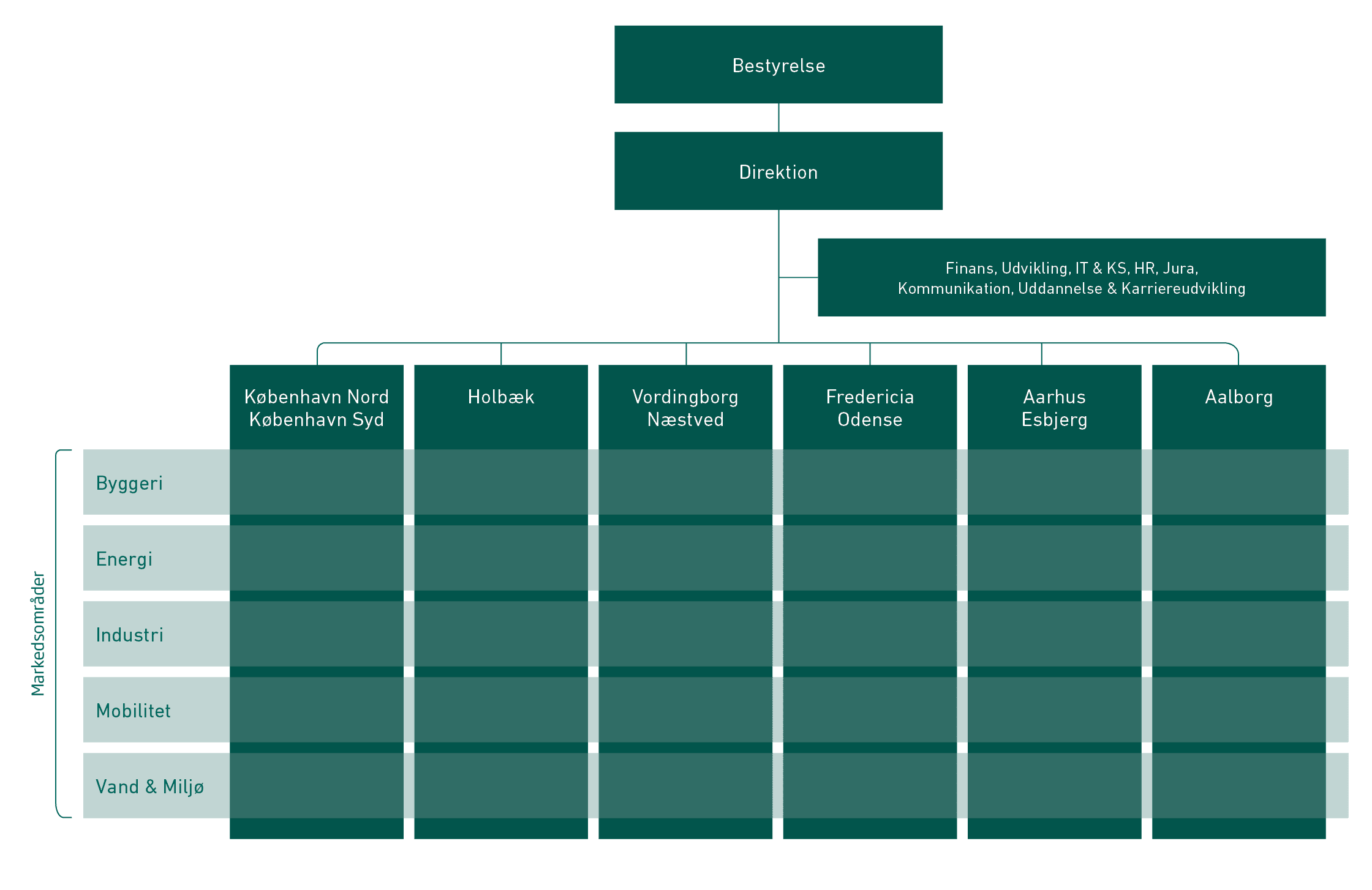 Forretningsområderne Byggeri, Energi, Industri, Mobilitet og Vand & Miljø er gennemgående i alle geografier, og der kan trækkes på ekspertise fra hele koncernen.